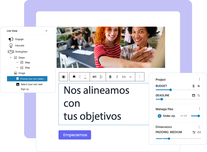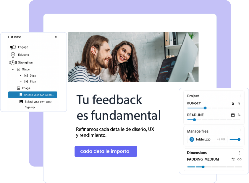 Tu feedback es fundamental. Refinamos cada detalle de diseño, usabilidad y rendimiento, asegurando que el producto final sea sólido y atractivo. Nos obsesionamos con la velocidad, el SEO y la experiencia de usuario.