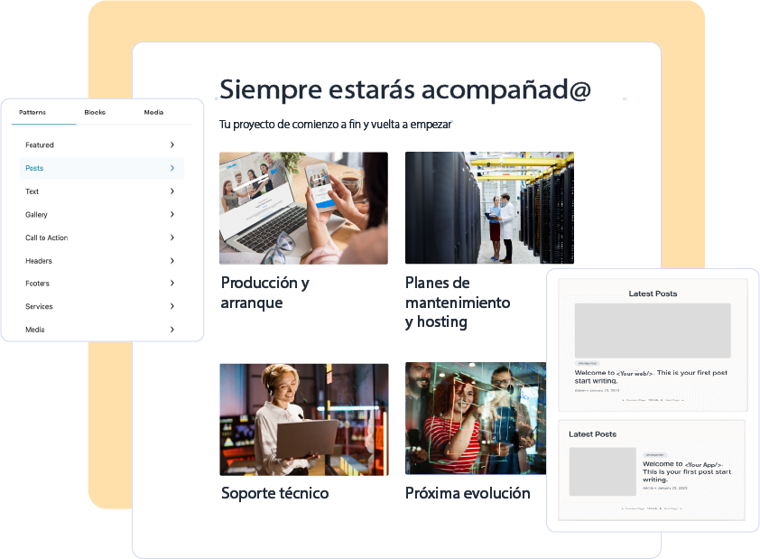 Ponemos tu proyecto en producción y te acompañamos en el arranque. Además, puedes contar con nuestros planes de mantenimiento, hosting administrado y soporte técnico para evolucionar tu solución sin preocupaciones.